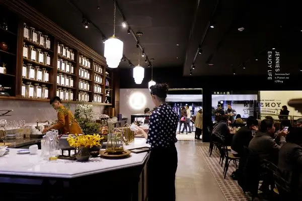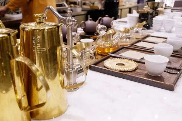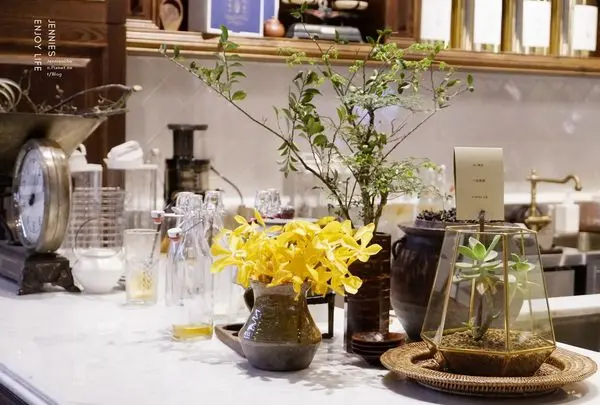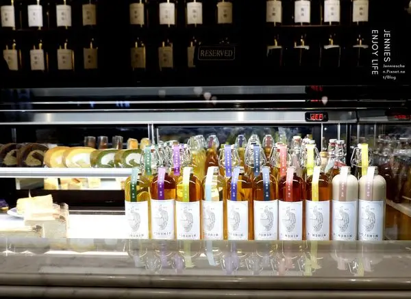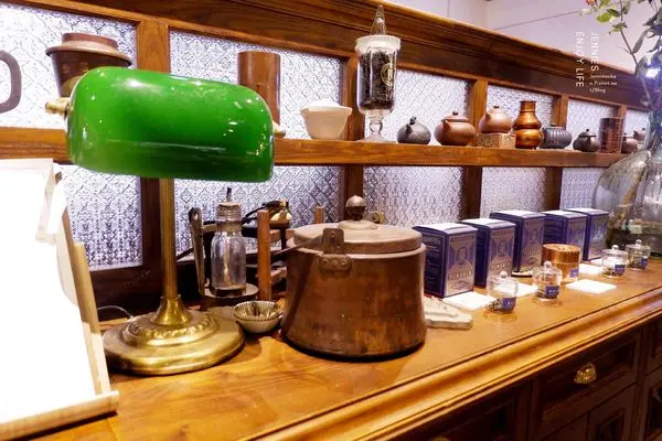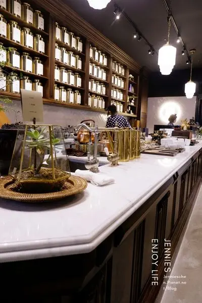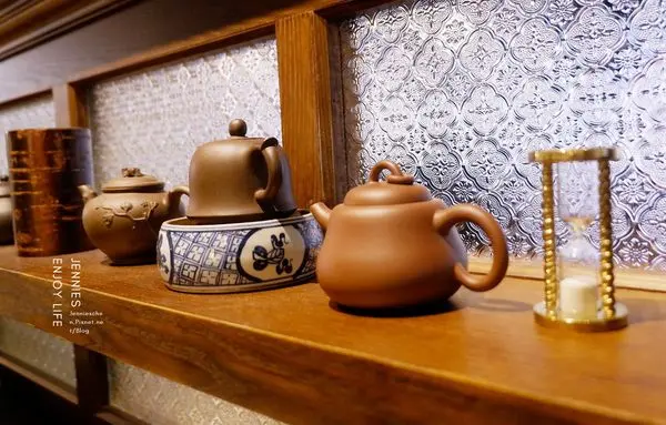 其實永心鳳茶跟台中宮原眼科的氣氛很相似,都是走中西混搭風格,走進永心鳳茶,裡頭一整面牆都是以茶罐為裝飾,櫃台內有一整套的茶具。