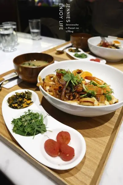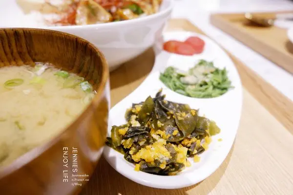 旁邊還附上海帶、龍鬚菜及醃製的小蕃茄;味噌湯及白飯都可以再續加。記得當天好姐妹問我好吃嗎?我說普通(應該是我覺得價位有點偏高),但以成本來看還算合理,如果茶的價格有比較中價位的選擇應該可以吸引更多朋友。