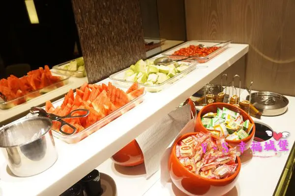 在用餐區的中間,有著一大。。。區的醬料,超多醬料的,還有水果、南瓜粥。。等可以使用。