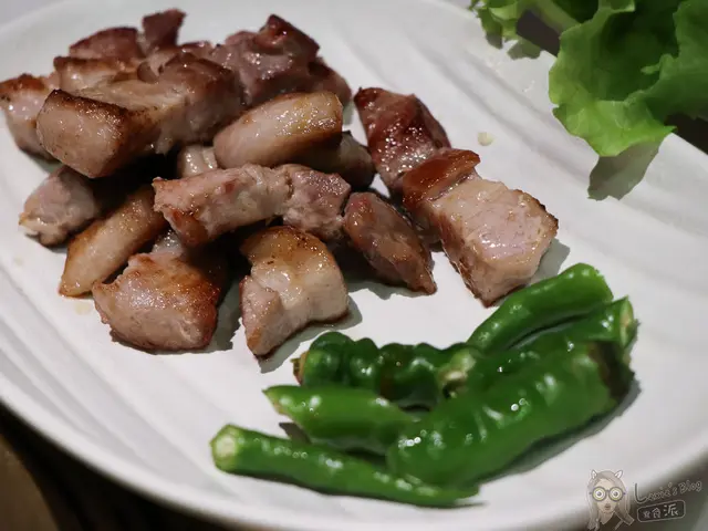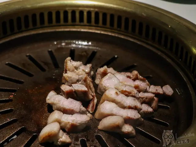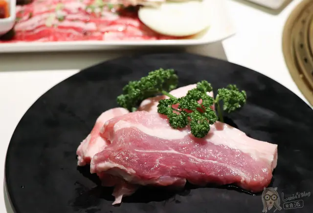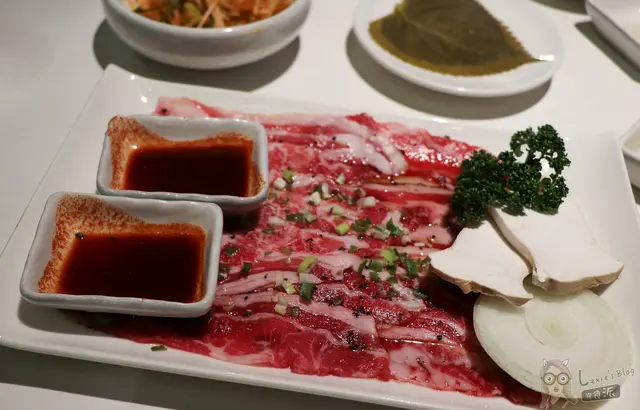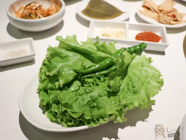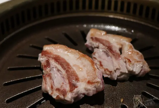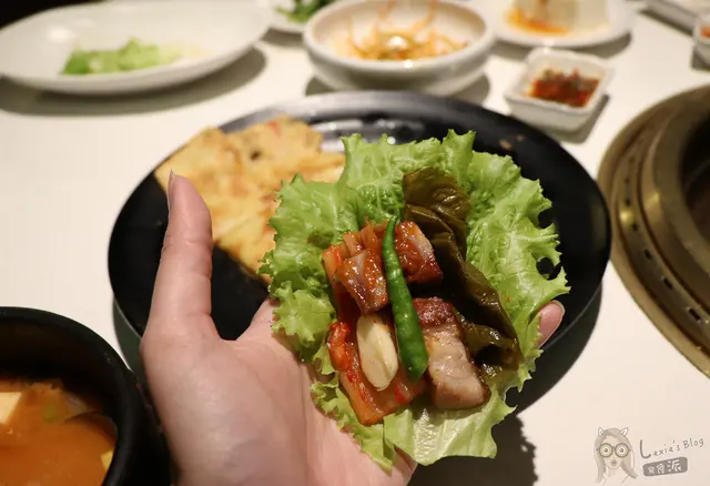 服務生會全程代烤,提供最適切的燒烤熟度,烤完後再剪成容易入口的大小。豬肉油花肥瘦均勻,怕豬油脂肪的人(我!)也不怕擔心,吃起來並不油膩,經燒烤後肉質非常彈牙,最適合包菜一起食用,整體口味中規中矩不算非常令人印象深刻。