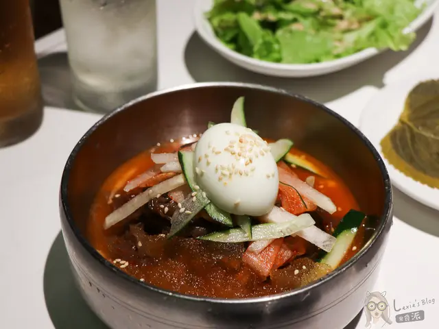 豐滿哥還滿腹疑問,一直問說這是乾拌麵嗎?因為看起來很濕呢(大笑)。韓式乾拌麵用米與蕎麥做的,口感Q彈,醬汁偏甜帶辣,混著些許蔬菜口感層次豐富,相當傑出,服務生會幫你在桌邊剪好,建議馬上食用才能嚐到最棒的口感。
