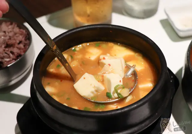 喝一口我就驚為天人,濃郁的鮮味包覆整個口腔,這股鮮味主要來自於湯中的小魚乾,而大醬濃郁的醬香中帶甜、帶點辣,匯聚了各種精華,口味真的很重,單喝有點太硬,建議跟韓國人一樣配著飯吃,會非常下飯唷,算是目前為止我在台灣喝過的大醬湯No.1。