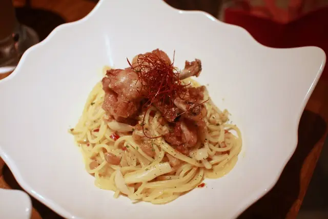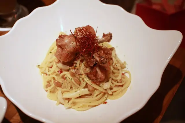 酥酥脆脆的雞皮搭配豆瓣醬醬汁與軟硬適中的麵條