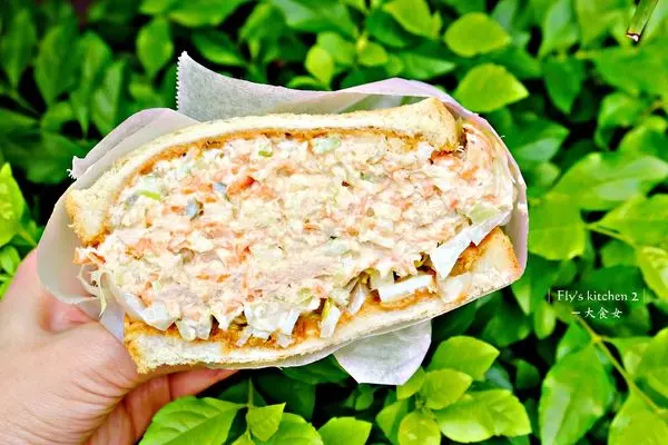 塗抹上花生醬的兩片吐司,裏頭包夾著幾乎是藏不住的鮪魚、高麗菜絲、洋蔥、紅蘿蔔、以及芹菜(完全意想不到!),