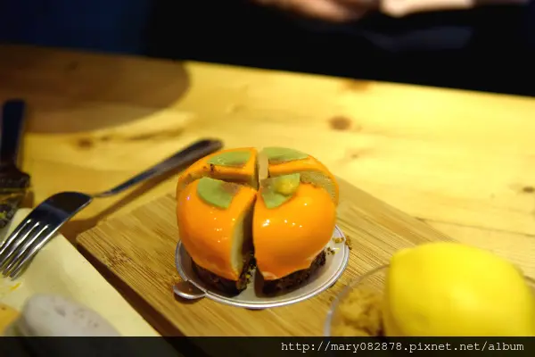 將檸檬餡獨立出來做成一顆黃檸檬,塔皮則變成一塊一塊的杏仁餅乾。