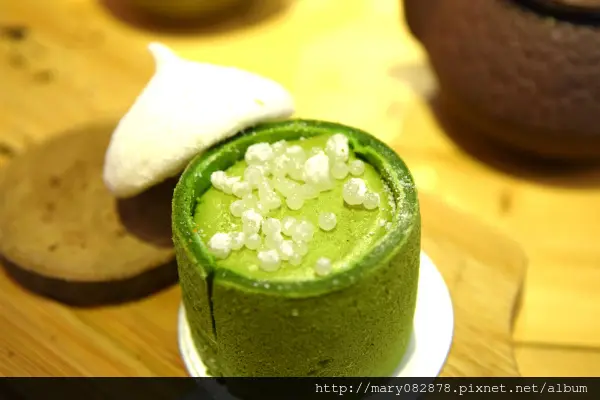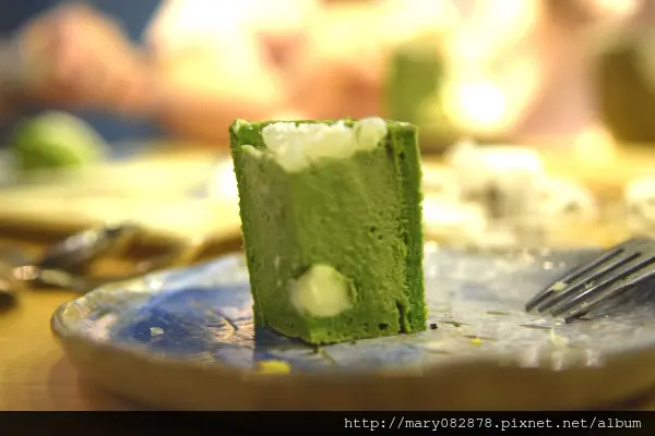 外層是抹茶蛋糕,裡頭則是抹茶白巧克力慕斯,茶味微甘微苦,