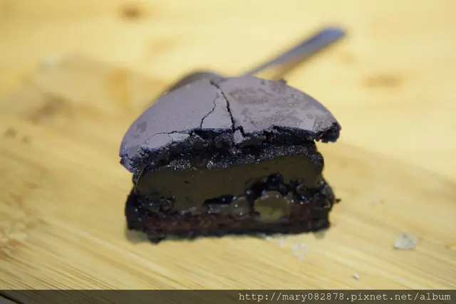 中間填入竹炭黑巧克力餡、巧克力蛋糕、綜合黑莓果醬,最底層則以竹炭可可塔皮作結束,