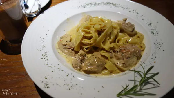 這份義大利麵很有誠意的使用雞腿肉,而且還很多塊!麵則是有點寬的麵條,有點偏硬。