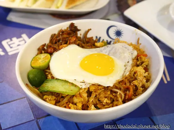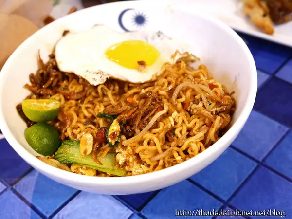美極炒麵是加了參巴醬的炒泡麵,放入蛋和豆芽去炒、然後再給上一些小魚乾花生,