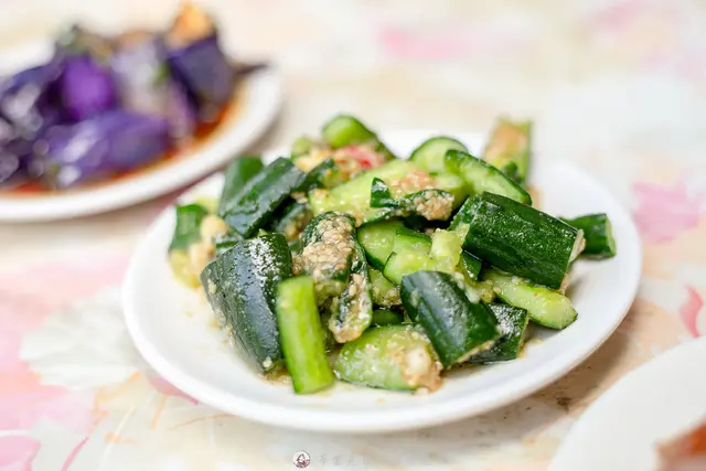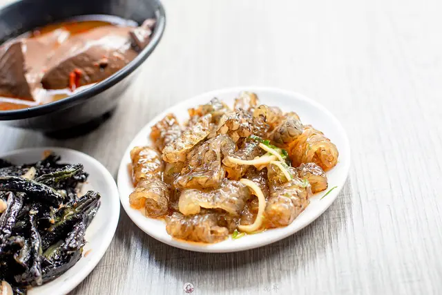 茄子還蠻入味的,口感很軟爛,我個人還蠻喜歡吃的;小黃瓜不是單純涼拌,有放麻醬下去拌,所以吃來會有顆粒感,然後小黃瓜很脆,整個搭起來口感很妙很豐富。魚皮吃起來很Q,帶有醋溜的酸氣,也是不錯吃的小菜。豆子看起來黑黑的但很好吃,會有蒜的香氣。