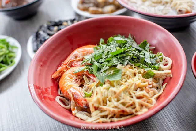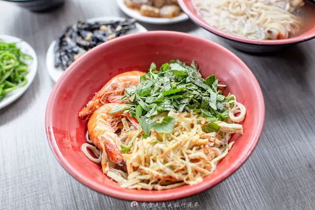 從以前吃到現在荊芥蝦油麵一直是我心頭的愛,我可是從原本65元吃到現在已經是100元,這麵看起來很簡單,就切碎的荊芥放上兩隻蝦子,淋上蝦油,這種越簡單的東西,就真的是越靠真功夫,這麵要吃得好瀝乾就要紮時,要不然水太多,蝦油的味道就出不來,要吃之前要先拌一下,在拌的時候蝦油的香氣就出來了,然後配上荊芥後香氣會有很層次,越吃越爽快,另外蝦子的部份我連殼吃,本身是有泡油,吃起來也蠻香的。