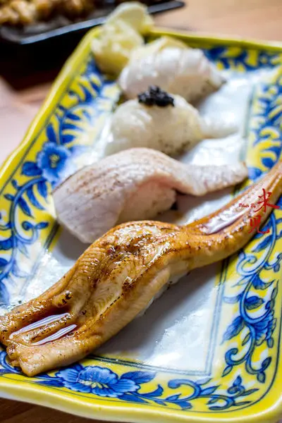 這裡的握壽司也很有水準,而且可以一貫一貫單點,這次點的是星鰻、紅魽、比目魚緣側、海鱺魚,不用多講,光看就知道很美味。