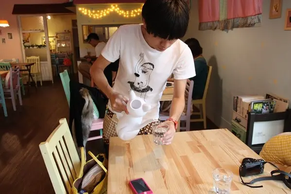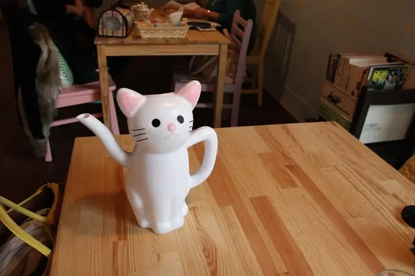 聽到我相機的快門聲馬上說阿要拍照阿,馬上把貓咪水壺放在桌上...