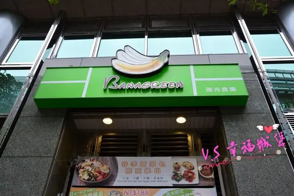 BANAGREEN 香蕉.綠 位在捷運西湖站和港墘站之間,以營養好吃又便宜的香蕉為形象設計,呈現餐廳健康平價的訴求。
