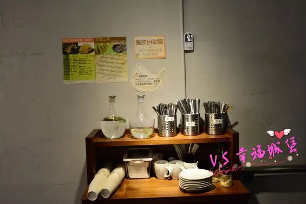 這邊的點餐方式是,進到店裡之後拿著菜單先幫自己找個好位子,接著再帶著菜單到櫃檯點餐,算是近乎全自助的方式(店家只會幫忙送餐),需要碗盤刀叉就到自助區自己拿,想要喝杯水一樣可以在自助區找到水瓶和水杯。