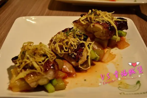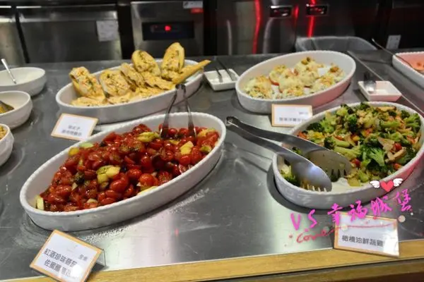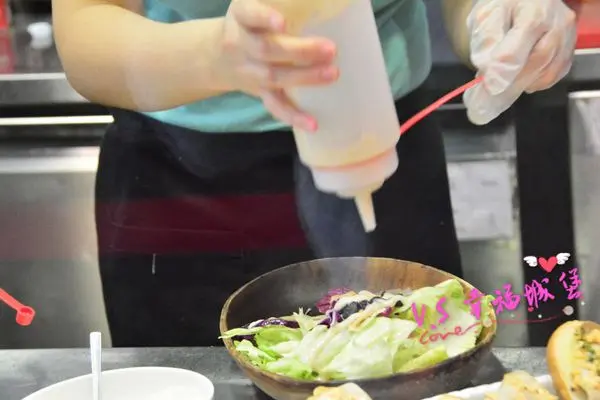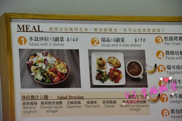 點餐的方式也滿特別的,這裡是採用主餐搭配沙拉的方式,選好主餐之後就可以挑選搭配主餐的一大盤沙拉和三種配菜,因為沙拉算是主打項目,因此搭配的醬料種類選擇也超多,如果是愛吃沙拉的人來到這裡感覺應該像來到天堂一樣,很適合正在減肥的 V女王。