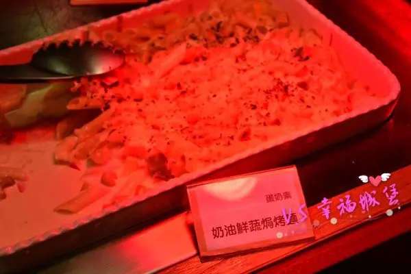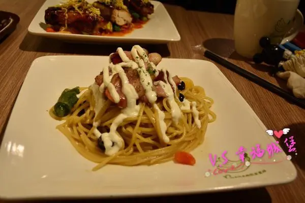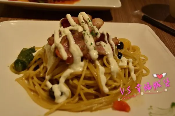 這道義大利麵使用的是傳統的義大利麵條搭配著煙燻培根肉,加了常用的甜椒及黑橄欖,最後淋上奶油白醬,麵條較為細長但口感卻很紮實。