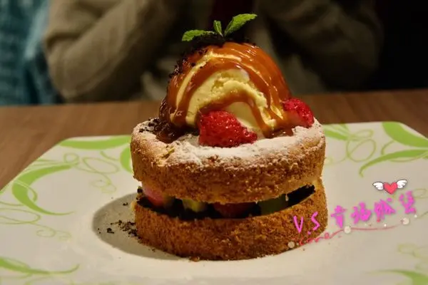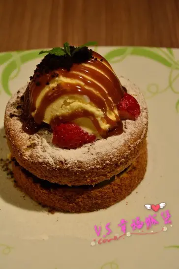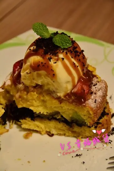 點餐前問了一下,是類似蛋糕的口感,切開來品嘗後,口感像是稍微濕潤的鬆餅,最上層勺上了一大球的香草冰淇淋,淋上焦糖醬。