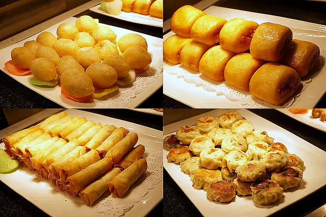 (左上順時鐘依序)鹹水餃、銀絲卷、韮菜餅、春捲