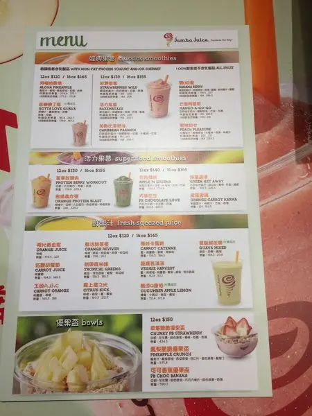Jamba Juice提供美式餐廳特有的大張Menu,可以像看報紙一樣的輕鬆,