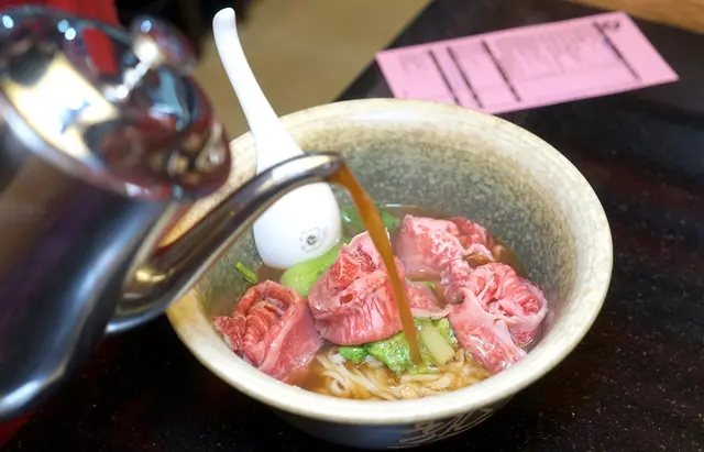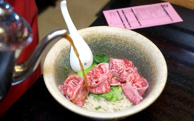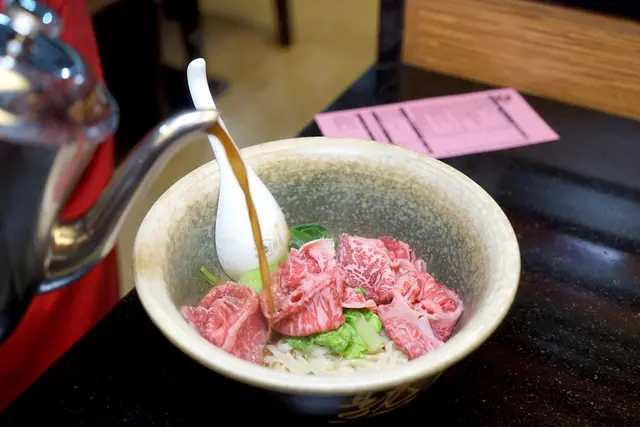 講究的湯頭、因為直接淋在和牛肉上頭~油花衝出的香氣更加高貴