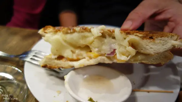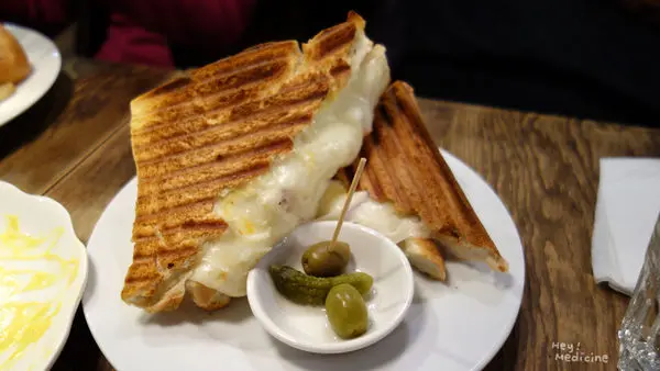 雀兒小餐館很有名的是「起司給得不手軟的帕尼尼」,所以苦主就點了一份蒜味雞肉帕尼尼,沒想到吃到一半之後他就說:「我覺得裡面好像沒有雞肉耶。」
