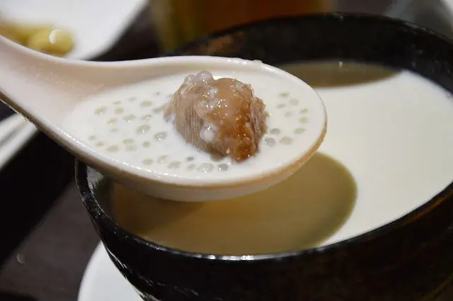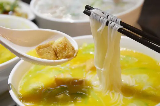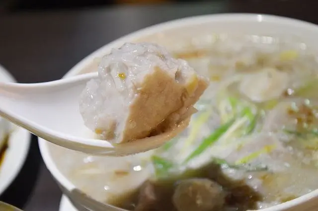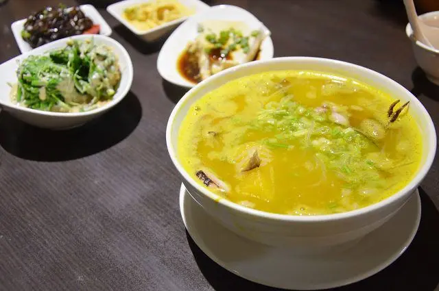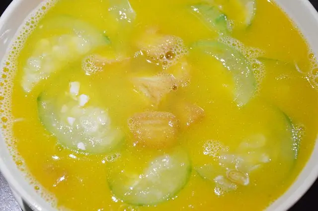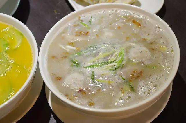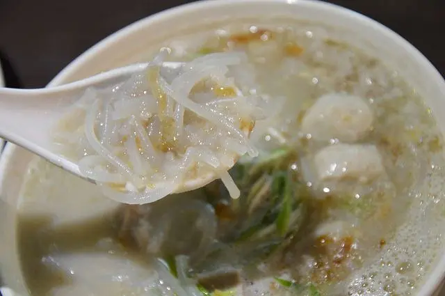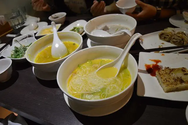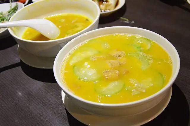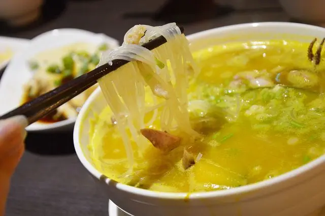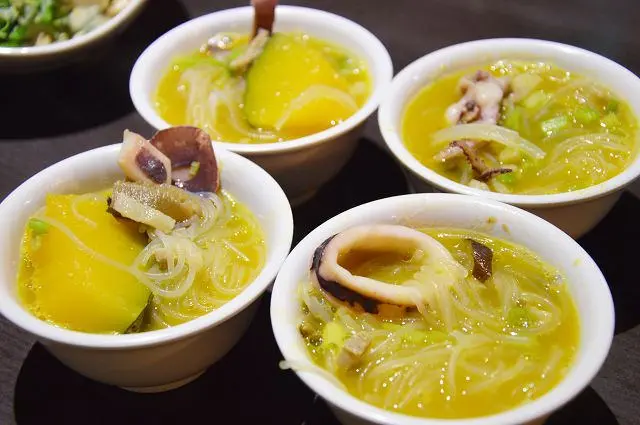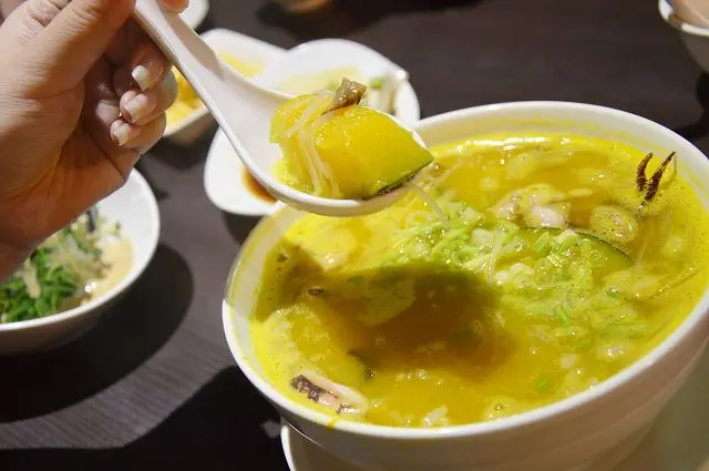 這道與南瓜米粉一樣都有著金黃的湯汁,不過之所以呈現金黃色並不是南瓜的原因,而是因為湯底裡加了鹹蛋黃。添加了鹹蛋後,讓湯頭呈現自然的鹹香,香氣撲鼻的湯汁,喝起來十分爽口。