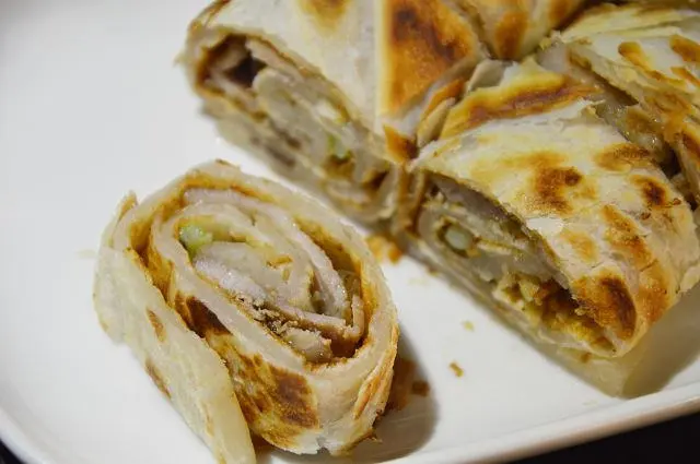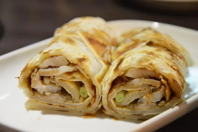 捲餅呈現外酥內嫩的口感,帶點咬勁的鹹豬肉片,搭配獨特醬料及蔥段,一大口咬下真是滿足!