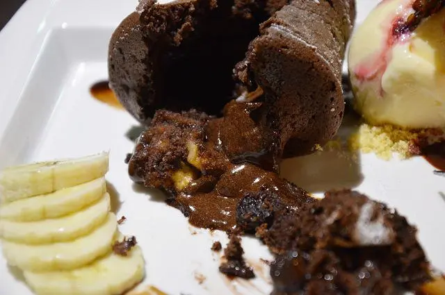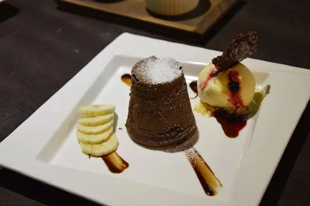 切開蛋糕後,熱呼呼的巧克力熔岩瞬間流出,入口後是暖呼呼的感覺,巧克力嚐起來綿密微甜,這道甜點在冬天裡品嚐非常有暖心的效果。