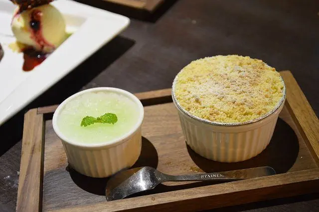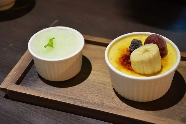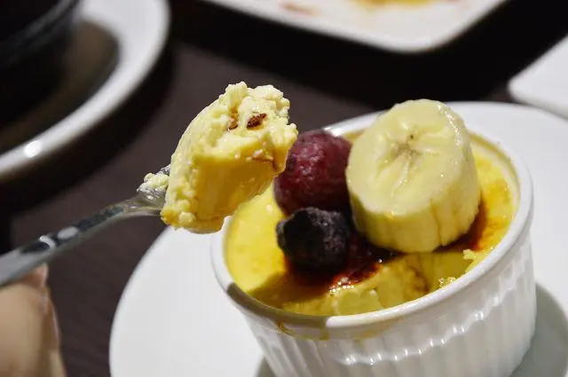 「西米焗布丁」(88元),這道是很特別的甜點,有著多層次的美味。一旁附有檸檬冰沙,酸甜滋味很有解膩效果。
