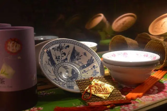 離開餐廳後,在樓梯間的展示櫃,寶小銘也駐足一會兒,欣賞客家風的擺設。