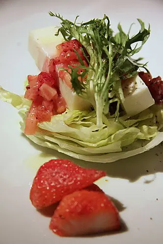 前菜之一的沙拉,蔬菜很新鮮爽脆,可能因為還在草莓產季,所以用了草莓做醬汁,味道很特別。