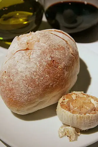 麵包是現烤的,配上低溫慢烤的大蒜,軟呼呼的抹在香軟的麵包上,再沾著油醋吃,相當不錯。