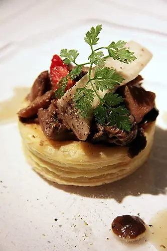 前菜之二的什麼酥盒,就是千層酥皮裡盛著用野菇等材料炒成的餡,調味很不錯~吃起來很豐潤的感覺。