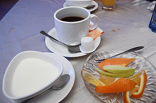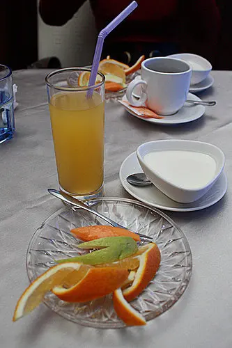 餐點的飲料分別是熱咖啡及果汁加上甜點奶酪及甜味十足的水果