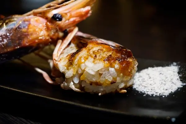 天使紅蝦吃完Q甜彈嫩的蝦肉,店家會把蝦頭塞入醋飯後烤過