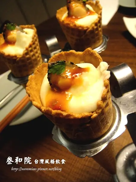 入座後等候了一陣子菜才上來, 一上菜就是好幾道, 有點讓人措手不及... 首先登場的五味九孔鮑不管是做法或是視覺都很創新, 霜淇淋甜筒底層裝的是高麗菜絲, 上面白色部份則是洋芋泥, 上面插了隻九孔鮑, 鹹甜滋味非常奇妙, 夾雜著餅皮咔滋的口感, 晃神中讓人有種錯覺像在吃甜點.