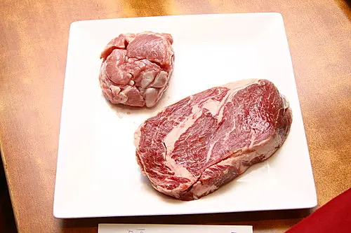每個人可以吃到肋眼和小牛肋眼~小牛肉因為是還沒斷奶的牛,所以肉色呈現粉紅色~這塊是小牛肋眼,因為還沒成形,肉質還很軟,所以看不太出肋眼的形狀~