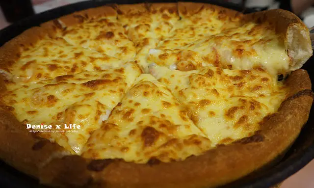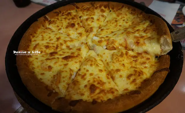 內容有:蝦、墨魚、蟹肉、洋菇。看看餅皮的剖面!真的好厚實