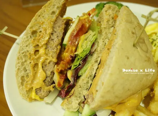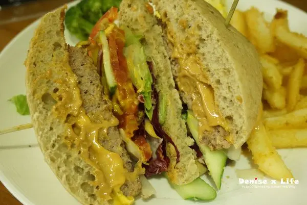 夢羅招牌-花生醬牛肉起士堡,有多層新鮮蔬菜、牛肉漢堡排、起士及滿嘴濃郁的花生醬