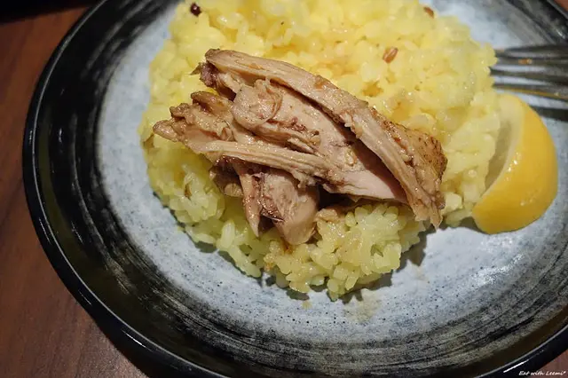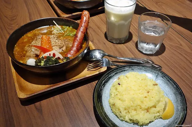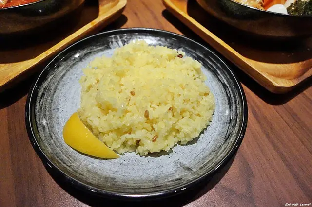 湯咖哩附餐白飯分量可選小/中/大,大份需另加30元,我們選的中份飯量其實有點少,配著味道稍重的湯咖哩吃感覺稍微不夠,呈現淡黃色的薑黃飯,顏色比氣味更鮮明,簡介上寫是越光米加入十穀米,但十穀的比例應不多,使得整體口感差異沒有想像中的鮮明,但我喜歡擠上檸檬的吃法,風味的轉換變化很有趣,多了一股清新酸爽。