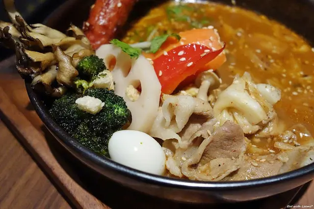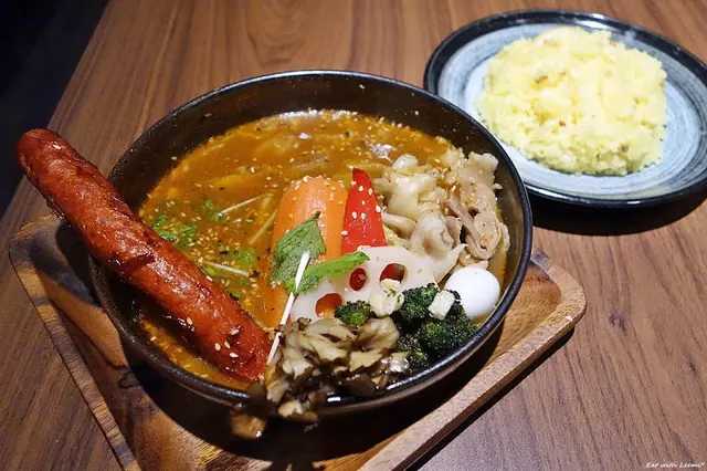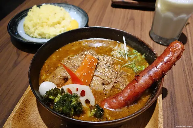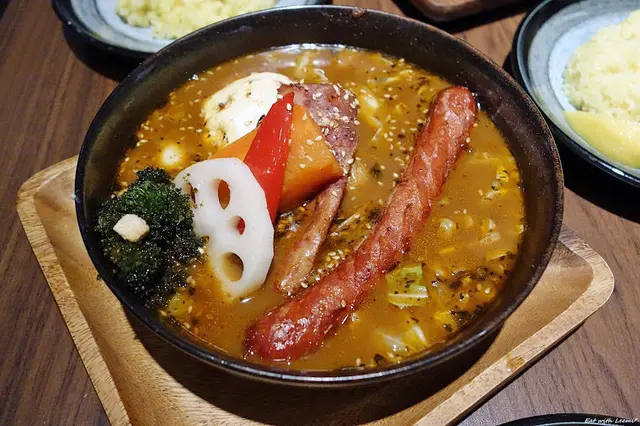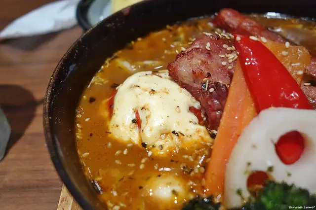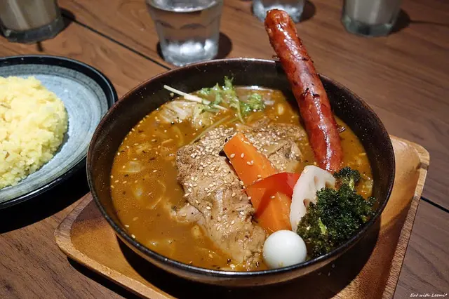 至於三款湯咖哩主食中,最受好評的是招牌的雞腿,輕易就能骨肉分離,口感挺柔嫩,炙燒起士番茄佐培根頗有洋食感,剛好搭的是辣度最低的湯咖哩,比較吃的到番茄的清爽風味,培根的部分比較意外是滿有厚度的,這兩道整體份量感都還算不錯,另外涮涮豬五花佐綜合菇這道肉片口感單薄,菇類份量也不多,如果不是因為有打卡活動贈送德國香腸恐怕吃來會覺得有些空虛吧,至於蔬菜雖然品質沒有特別突出(日本的店面主要是用北海道產蔬菜,依季節調整有時也會用來自北海道以外的產品),不過處理程序是有被注意的,像是各種蔬菜就有依照種類選擇不同的料理方式,青花菜是炸過的,馬鈴薯也算鬆透,不過湯咖哩的緣故所致,味道主要附著在表面而已,不能用燉煮的標準來要求入味程度。