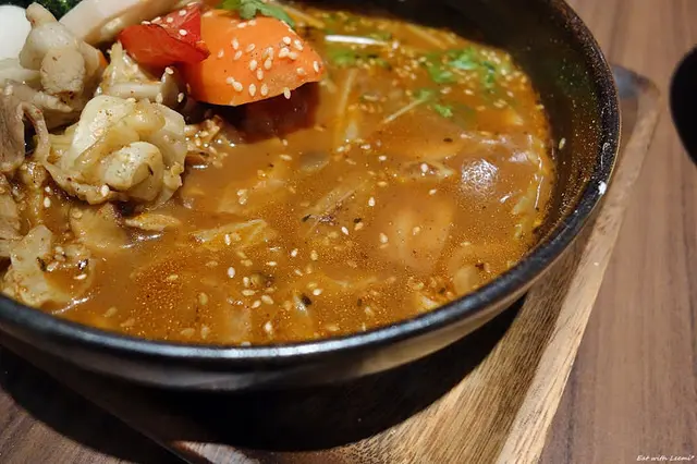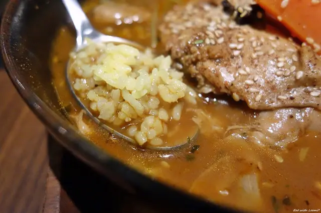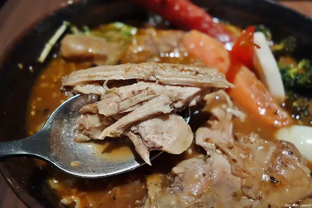 這裡主打的湯咖哩據說是用雞豬骨熬湯底,沒有加粉增稠,基底的鹹度很足,香料風味繁複有種類似中藥感的印象,整體像是口感較厚重還帶點油膩感的湯品,不過因為是要配著飯一起吃的料理所以可以理解,建議的食用方式是以湯匙挖取米飯浸到咖哩湯裡享用,湯咖哩可選辣度範圍為1-40級,但10級以上就需要另外加價了,這天分別點了1、5、7三種辣度的湯咖哩,最低的1級完全沒有辛辣感,反而覺得湯底本身帶微微的甜度,同桌不太能吃辣的朋友也可以接受,而5級對平常敢吃辣的人而言應該也只是小辣的程度,但跳到7級的辣度差距頗大,一入口就是很有感的辛辣刺激,後來看解說提到超過5級會多加綠辣椒,也許是這緣故所致。