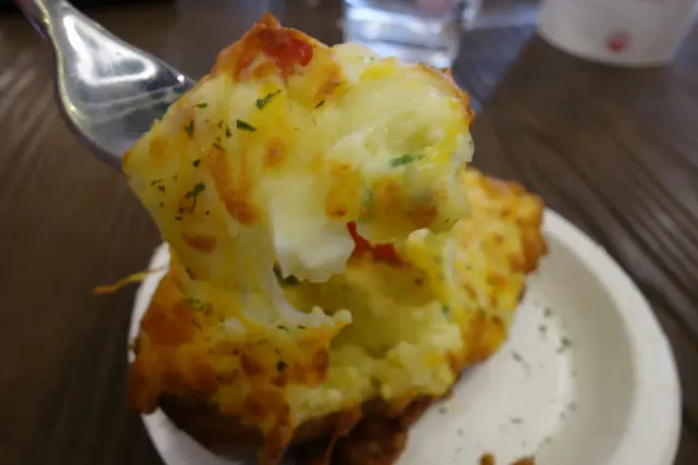 先把馬鈴薯蒸熟後將全部的馬鈴薯肉挖出,再回填加入小黃瓜丁/小番茄塊與大量的起司去烤