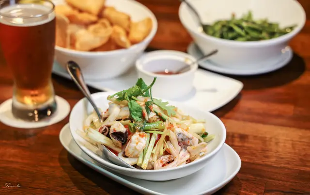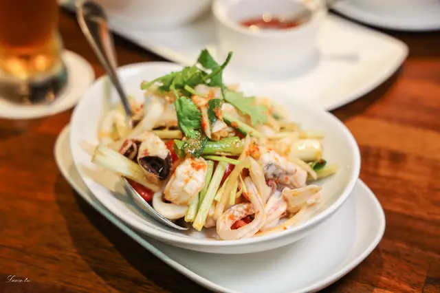 鮮爽開胃的涼拌海鮮,用料很豐富,裡面有蝦仁、花枝、蟹肉等等,加上芹菜、香菜、檸檬汁、魚露的辛香條配。