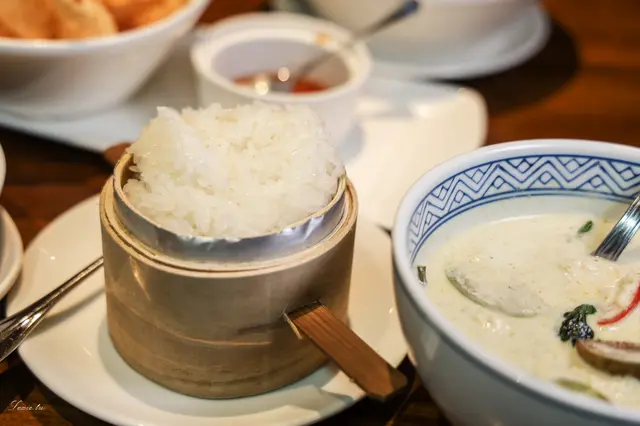 帶一點點微辣與椰汁奶味,下飯好幫手,特別的是它還有附贈一碗糯米,雖然說我不知道為什麼要加糯米吃XDD,但口感也不差。