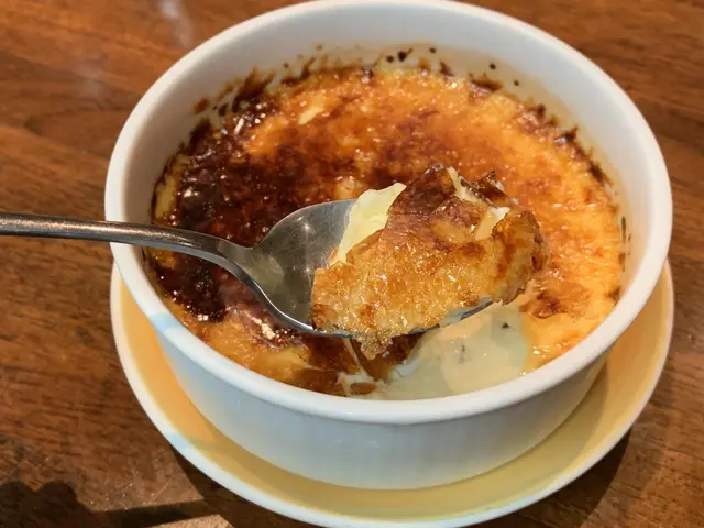 飯後點了一個甜點做結尾,硬脆的焦糖敲下去的瞬間療育感十足,滑溜軟綿的烤布蕾正中紅心。