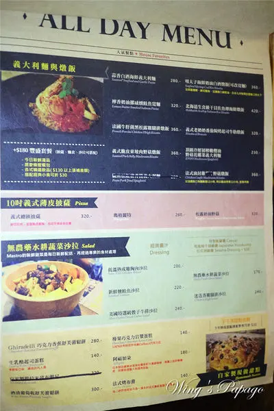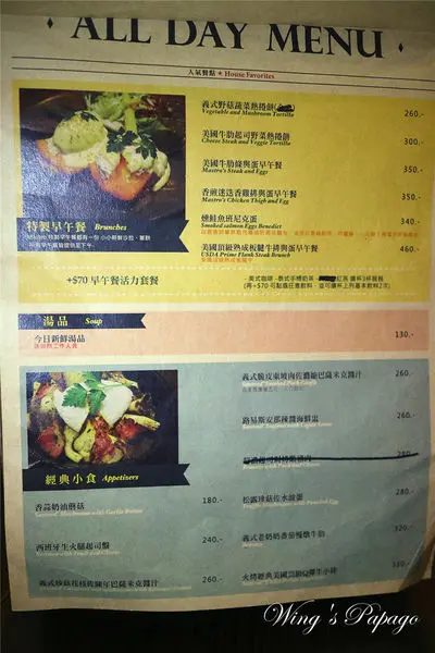 精選肉食、特製早午餐、湯品、經典小食、義大利麵與燉飯、
