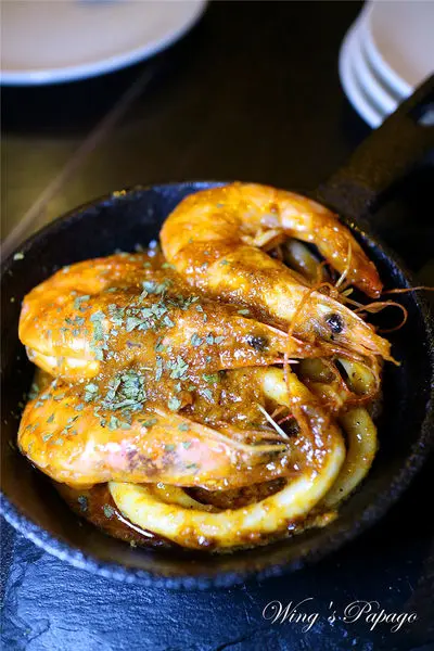 也是以小鐵鍋送上桌,有三大尾大蝦及透抽,