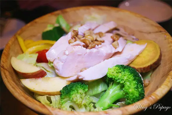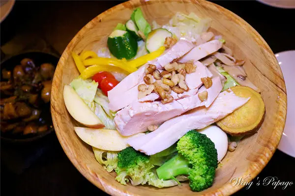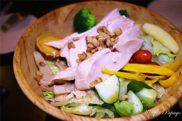 沙拉以木碗盛裝,份量之多,兩人吃一碗也綽綽有餘。